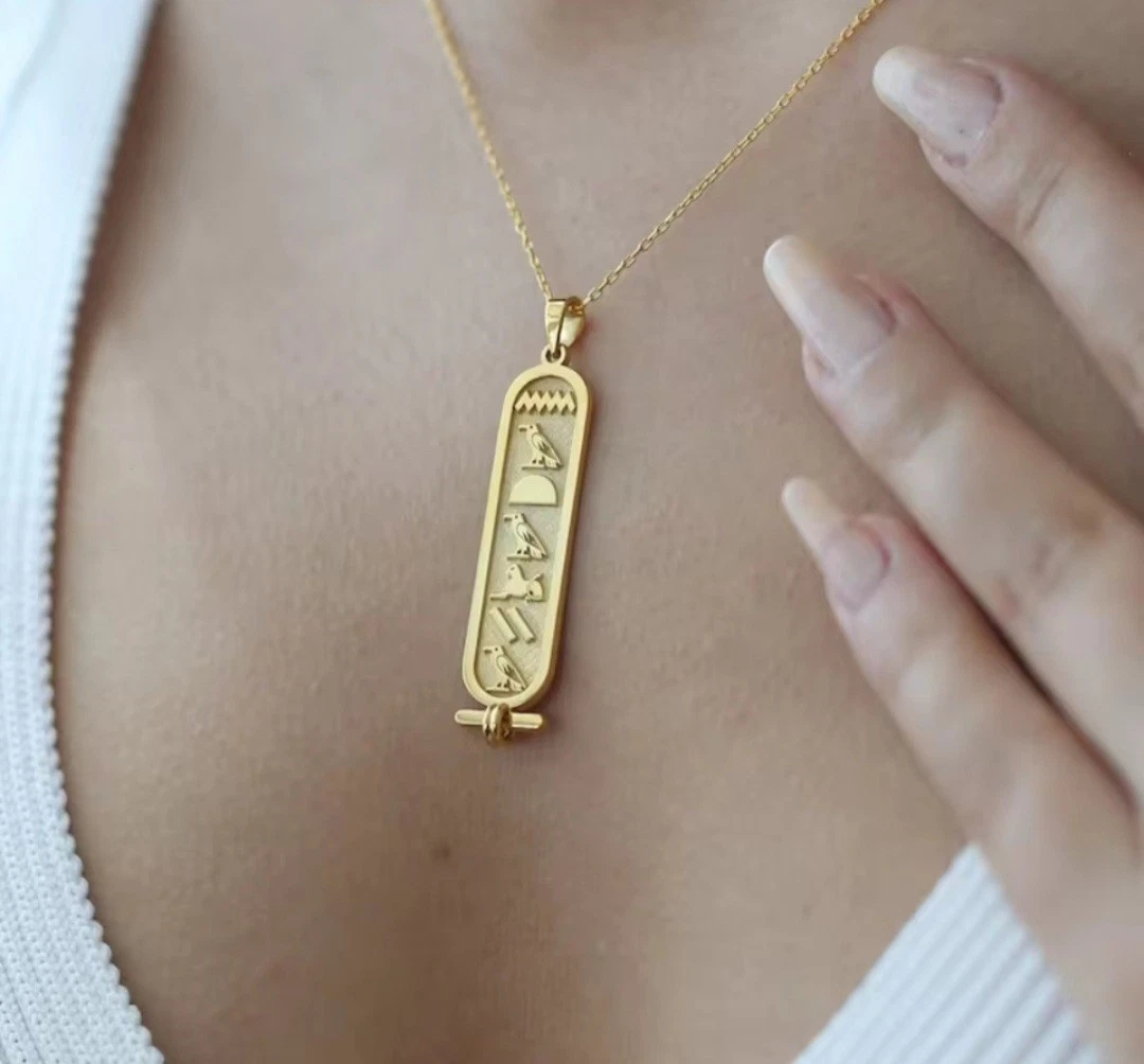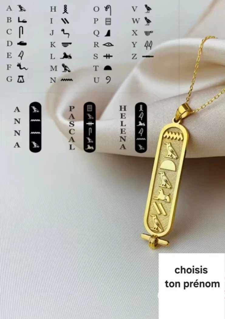 Je vous propose ce cartouche hiéroglyphique personnalisé, gravé avec votre prénom en hiéroglyphes égyptiens. Le pendentif mesure 4 cm de hauteur et 1 cm de largeur, accompagné d’une chaîne en acier inoxydable ajustable de 35 à 55 cm. Il allie élégance moderne et symbolique sacrée.